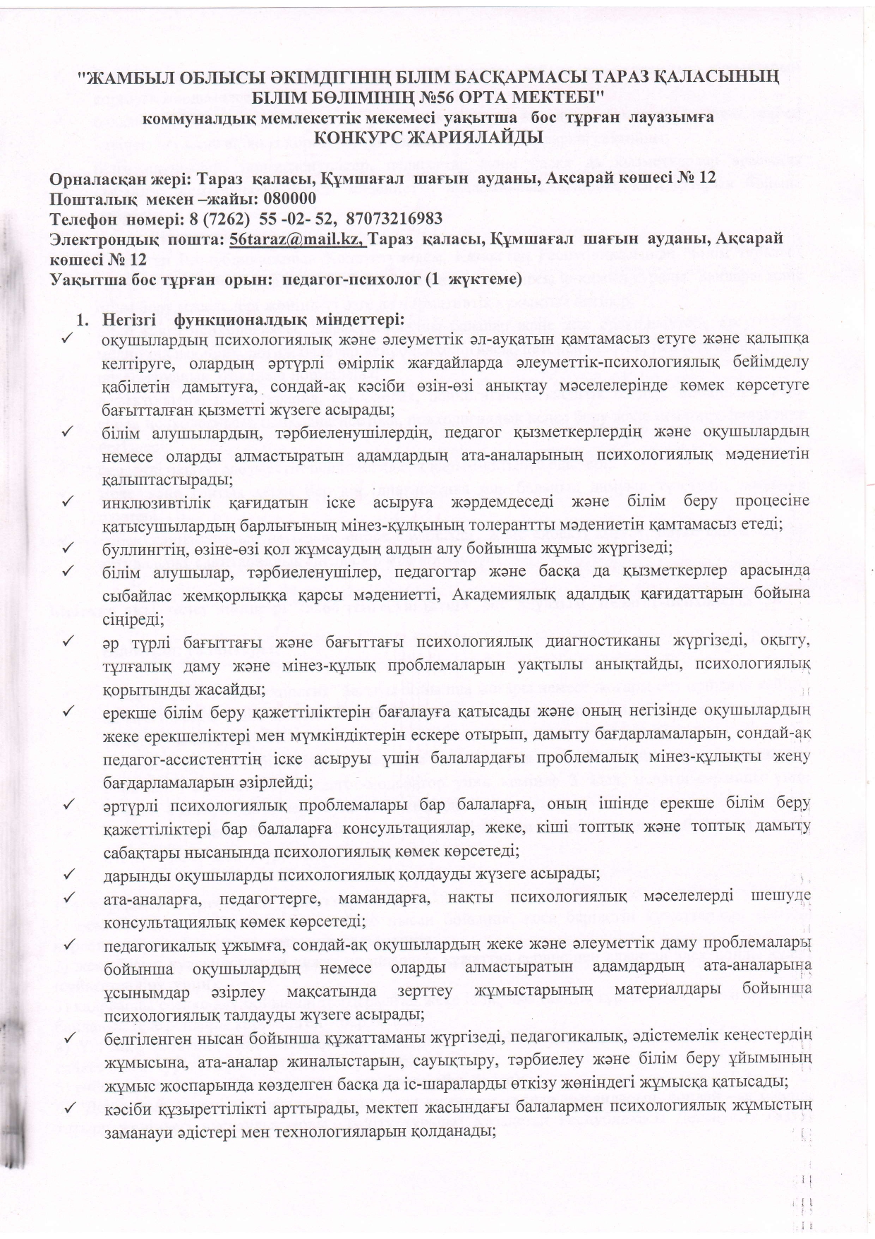 Уақытша бос тұрған лауазымға конкурс (педагог-психолог) » СШ №56